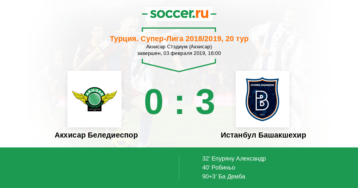 Турция. Суперлига 01.04.2018 Акхисар Беледиеспор Логотип футбольный клуб Акхисар Беледиеспор 1:2 Логотип футбольный клуб Истанбул Башакшехир (Стамбул) Истанбул Башакшехир