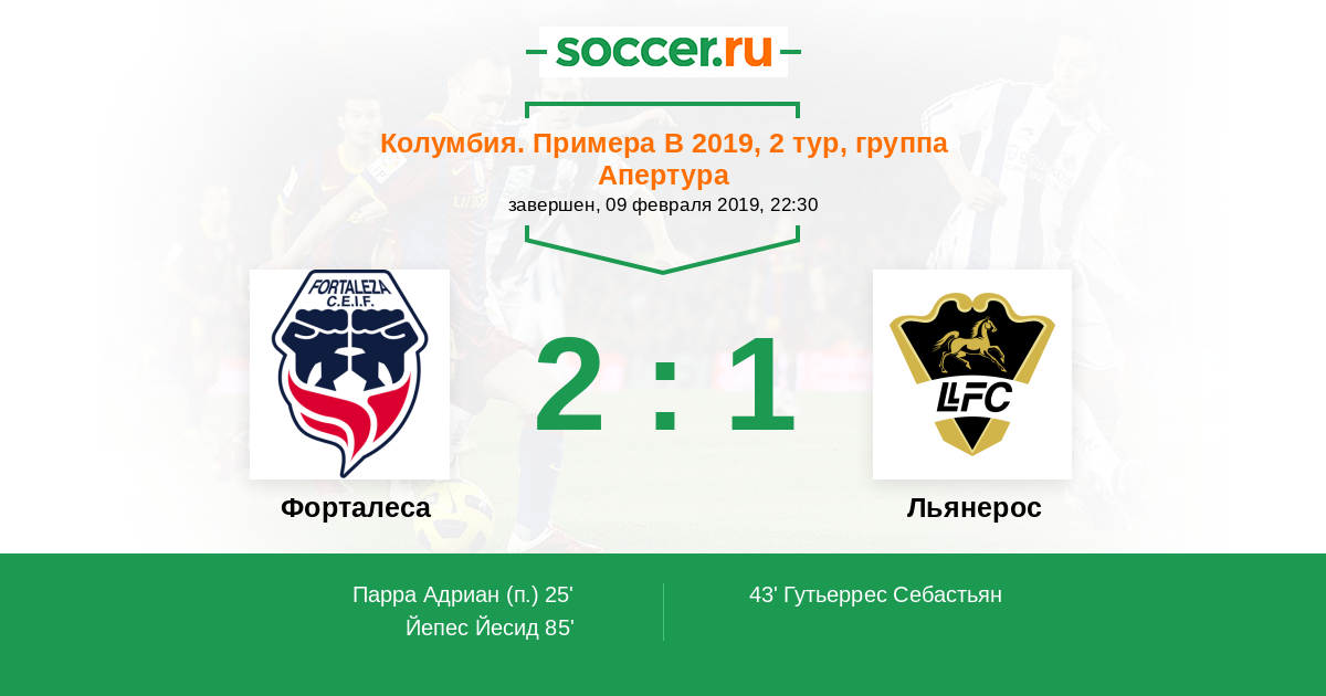 Колумбия. Примера B 27.02.2021 Льянерос Логотип футбольный клуб Льянерос (Вильявисенсио) 2:1 Логотип футбольный клуб Форталеса (Богота) Форталеса