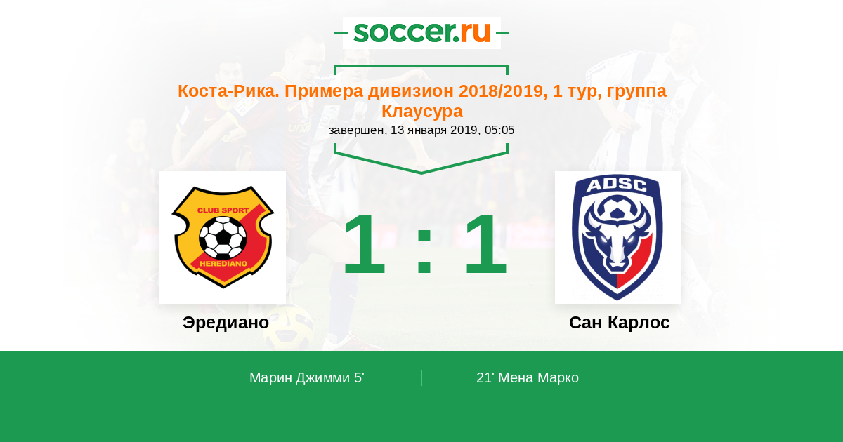 Коста-Рика. Примера дивизион 05.02.2017 Эредиано Логотип футбольный клуб Эредиано 3:2 Логотип футбольный клуб Сан Карлос (Сьюдад Куэсада) Сан Карлос