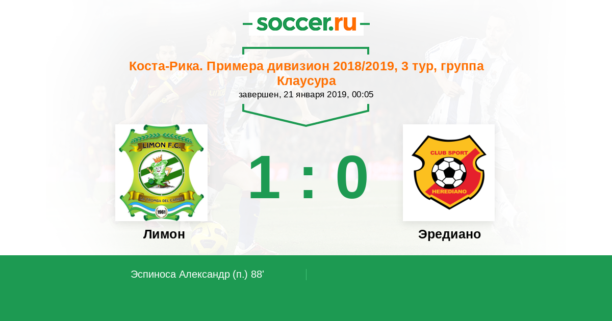 Коста-Рика. Примера дивизион 29.03.2018 Эредиано Логотип футбольный клуб Эредиано 1:0 Логотип футбольный клуб Лимон Лимон