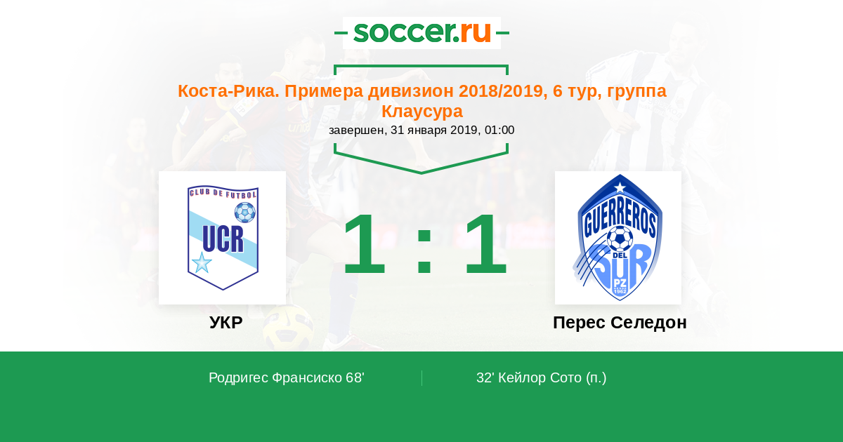 Коста-Рика. Примера дивизион 13.01.2018 УКР Логотип футбольный клуб УКР (Сан Хосе) 2:1 Логотип футбольный клуб Зеледон (Сан Исидро де Эль Хенерал) Зеледон
