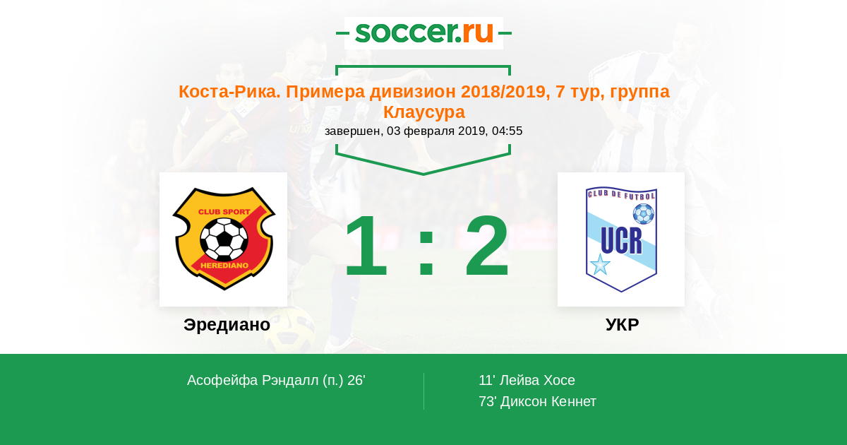 Коста-Рика. Примера дивизион 13.04.2014 УКР Логотип футбольный клуб УКР (Сан Хосе) 2:0 Логотип футбольный клуб Эредиано Эредиано