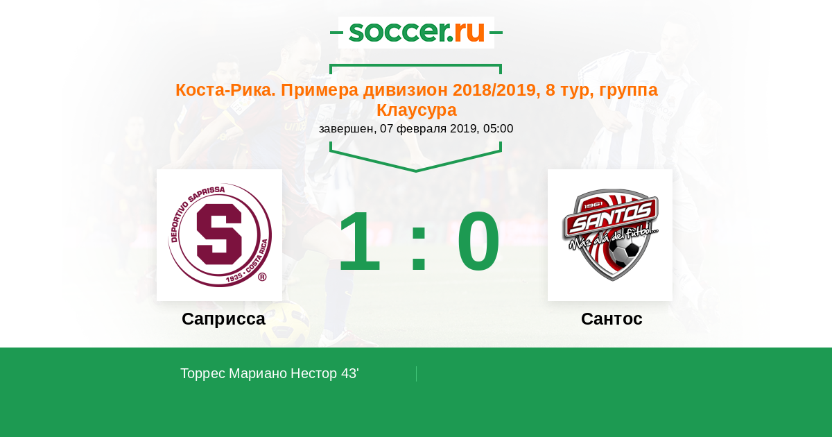 Коста-Рика. Примера дивизион 01.04.2019 Сантос Логотип футбольный клуб Сантос (Гуапилес) 5:3 Логотип футбольный клуб Саприсса (Сан Хосе) Саприсса