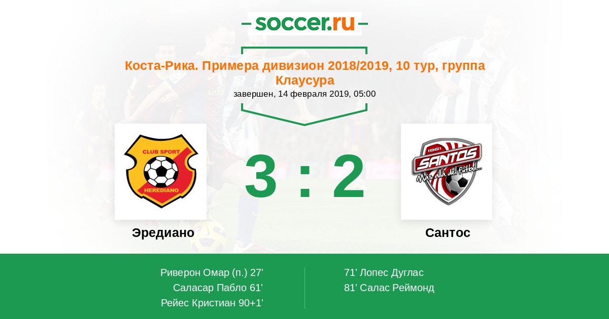 Коста-Рика. Примера дивизион 20.10.2013 Сантос Логотип футбольный клуб Сантос (Гуапилес) 3:2 Логотип футбольный клуб Эредиано Эредиано