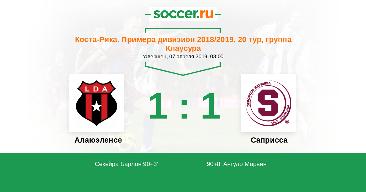Коста-Рика. Примера дивизион 13.05.2018 Саприсса Логотип футбольный клуб Саприсса (Сан Хосе) 1:1 Логотип футбольный клуб Алаюэленсе (Алаюэла) Алаюэленсе