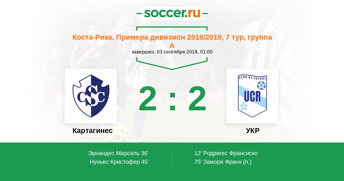 Коста-Рика. Примера дивизион 11.03.2019 Картахинес Логотип футбольный клуб Картахинес (Карфаген) 2:2 Логотип футбольный клуб УКР (Сан Хосе) УКР