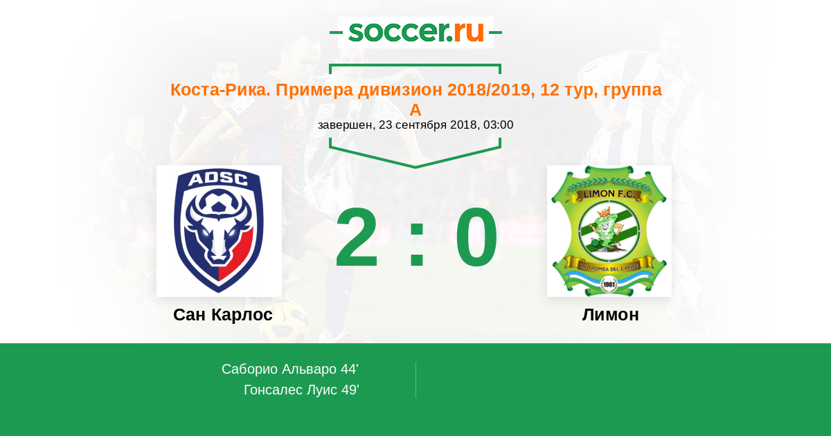 Коста-Рика. Примера дивизион 12.02.2012 Сан Карлос Логотип футбольный клуб Сан Карлос (Сьюдад Куэсада) 0:1 Логотип футбольный клуб Лимон Лимон