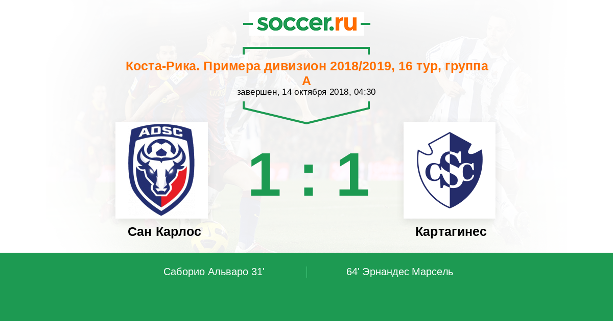 Коста-Рика. Примера дивизион 14.04.2019 Сан Карлос Логотип футбольный клуб Сан Карлос (Сьюдад Куэсада) 2:0 Логотип футбольный клуб Картахинес (Карфаген) Картахинес