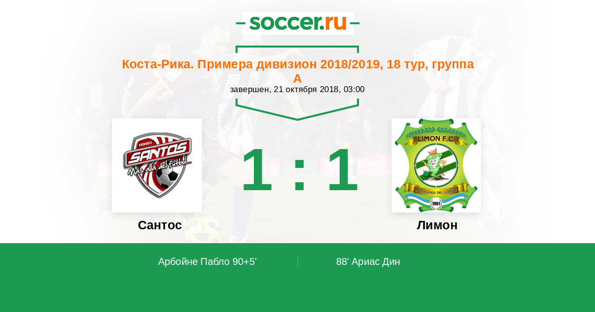 Коста-Рика. Примера дивизион 01.11.2017 Лимон Логотип футбольный клуб Лимон 1:1 Логотип футбольный клуб Сантос (Гуапилес) Сантос