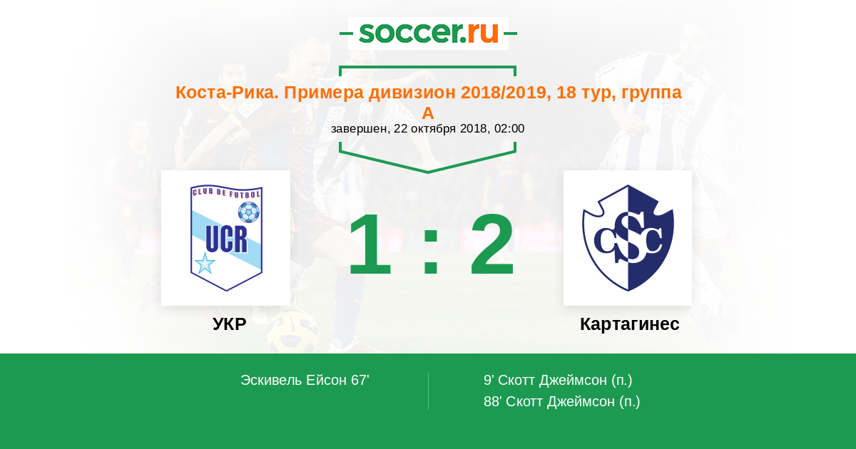 Коста-Рика. Примера дивизион 03.09.2018 Картахинес Логотип футбольный клуб Картахинес (Карфаген) 2:2 Логотип футбольный клуб УКР (Сан Хосе) УКР