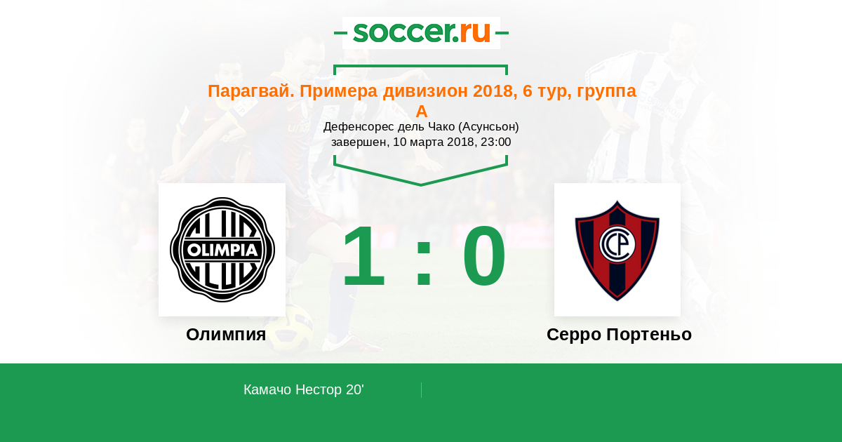 Парагвай. Примера дивизион 23.02.2020 Олимпия Логотип футбольный клуб Олимпия (Асунсьон) 1:1 Логотип футбольный клуб Серро Портеньо (Асунсьон) Серро Портеньо