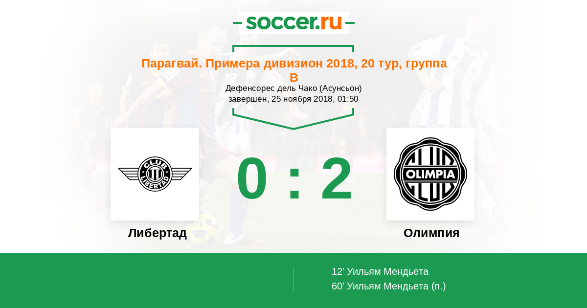 Парагвай. Примера дивизион 12.06.2012 Олимпия Логотип футбольный клуб Олимпия (Асунсьон) 2:1 Логотип футбольный клуб Либертад (Асунсьон) Либертад