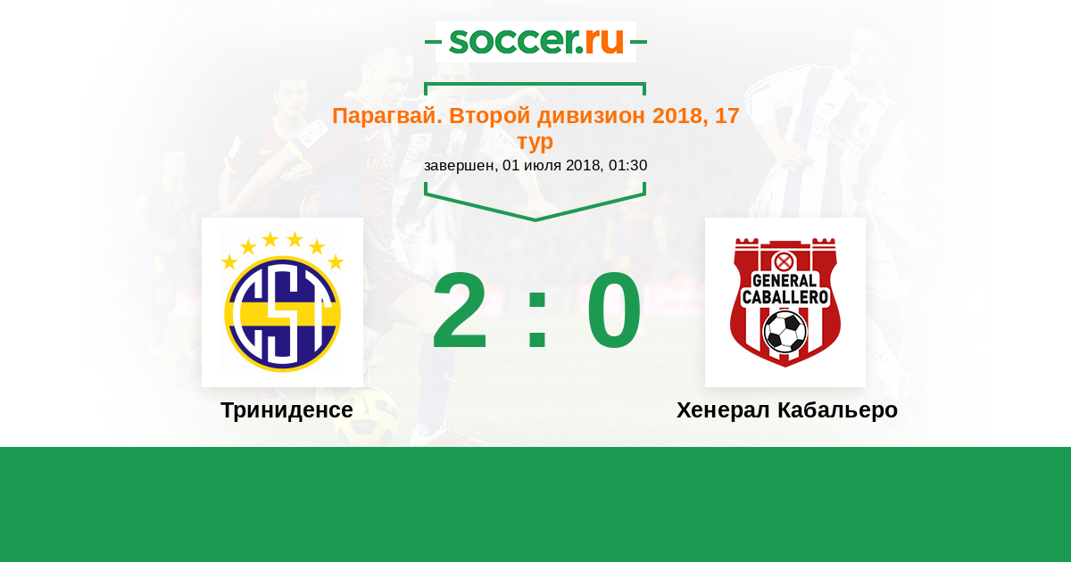 Парагвай. Второй дивизион 09.06.2019 Триниденсе Логотип футбольный клуб Триниденсе (Асунсьон) 1:1 Логотип футбольный клуб Хенерал Кабальеро (Доктор-Хуан-Леон-Майоркин) Хенерал Кабальеро