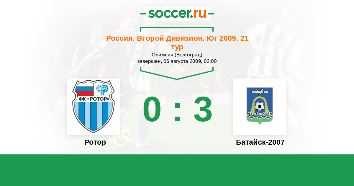 Россия. Вторая лига. Группа 1 17.04.2009 Батайск-2007 Логотип футбольный клуб Батайск-2007 0:0 Логотип футбольный клуб Ротор (Волгоград) Ротор