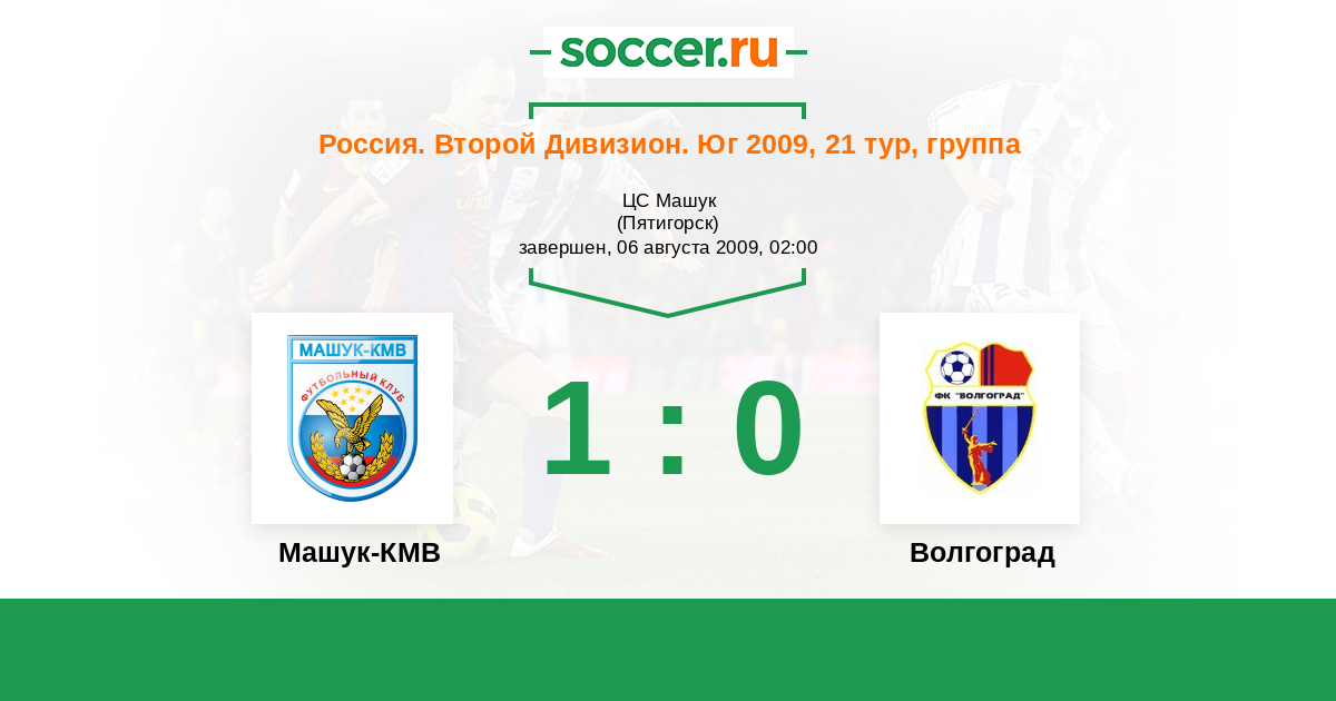 Россия. Вторая лига. Группа 1 17.04.2009 Волгоград Логотип футбольный клуб Волгоград 1:2 Логотип футбольный клуб Машук-КМВ (Пятигорск) Машук-КМВ