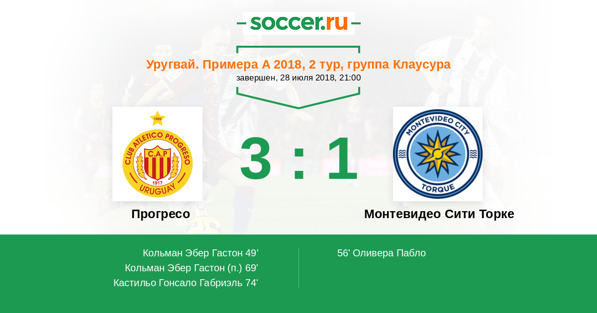 Уругвай. Примера A 07.06.2018 Прогресо Логотип футбольный клуб Прогресо (Монтевидео) 0:2 Логотип футбольный клуб Монтевидео Сити Торке Монтевидео Сити Торке