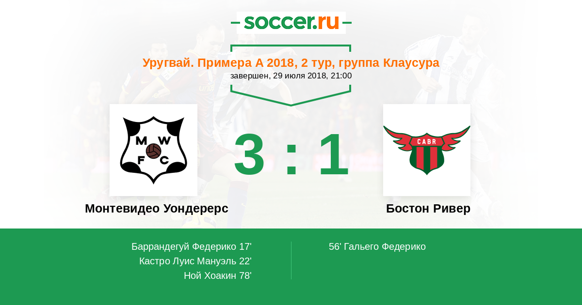Уругвай. Примера A 25.03.2017 Монтевидео Уондерерс Логотип футбольный клуб Монтевидео Уондерерс 2:1 Логотип футбольный клуб Бостон Ривер (Монтевидео) Бостон Ривер