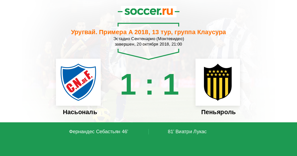 Уругвай. Примера A 11.11.2018 Насьональ Логотип футбольный клуб Насьональ (Монтевидео) 1:1 Логотип футбольный клуб Пеньяроль (Монтевидео) Пеньяроль