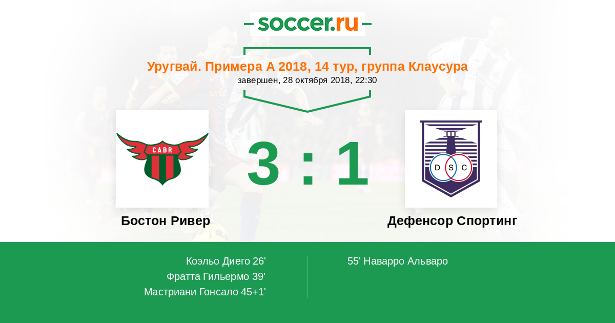 Уругвай. Примера A 30.04.2018 Дефенсор Спортинг Логотип футбольный клуб Дефенсор Спортинг (Монтевидео) 2:1 Логотип футбольный клуб Бостон Ривер (Монтевидео) Бостон Ривер