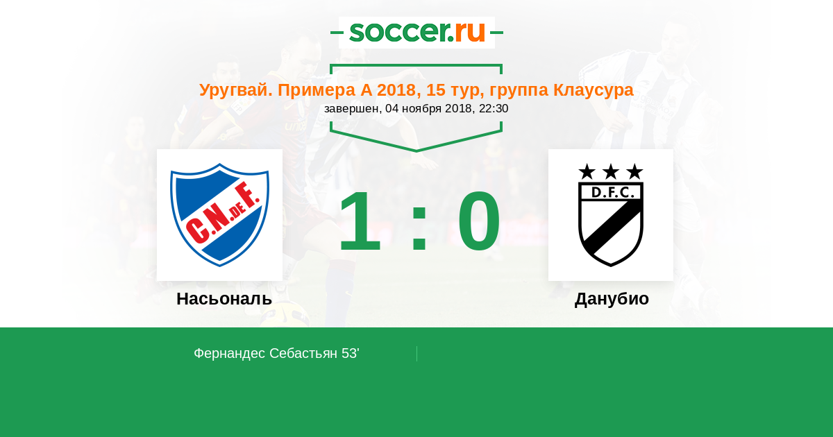 Уругвай. Примера A 21.11.2015 Данубио Логотип футбольный клуб Данубио (Монтевидео) 2:0 Логотип футбольный клуб Насьональ (Монтевидео) Насьональ