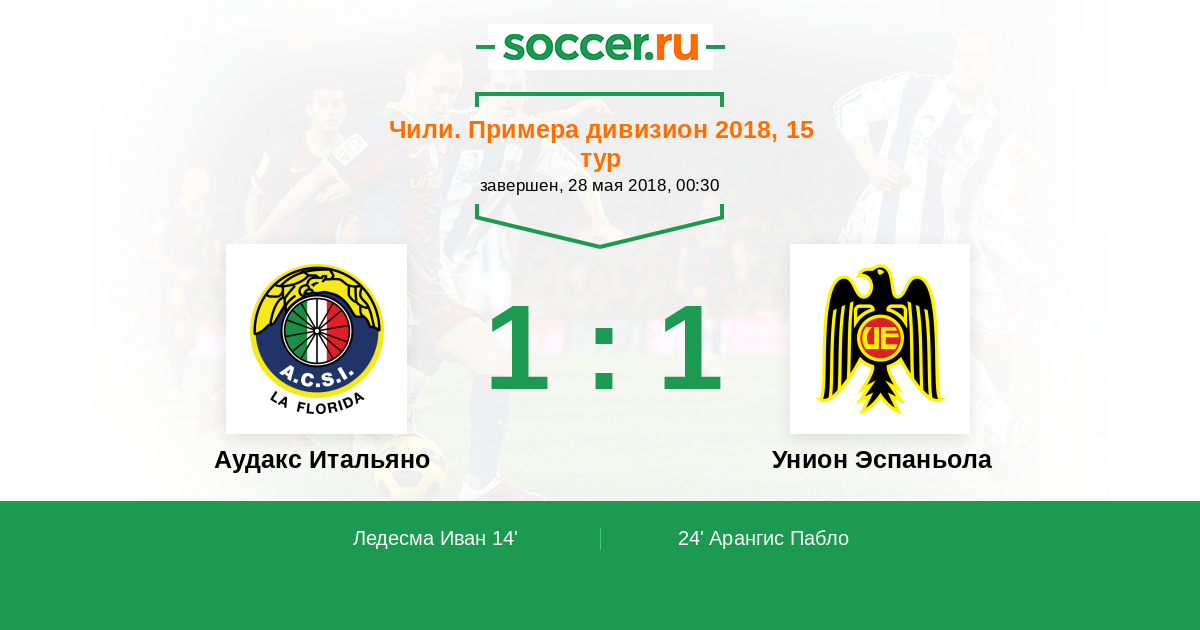 Чили. Примера дивизион 01.05.2021 Унион Эспаньола Логотип футбольный клуб Унион Эспаньола (Сантьяго) 1:1 Логотип футбольный клуб Аудакс Итальяно (Сантьяго) Аудакс Итальяно