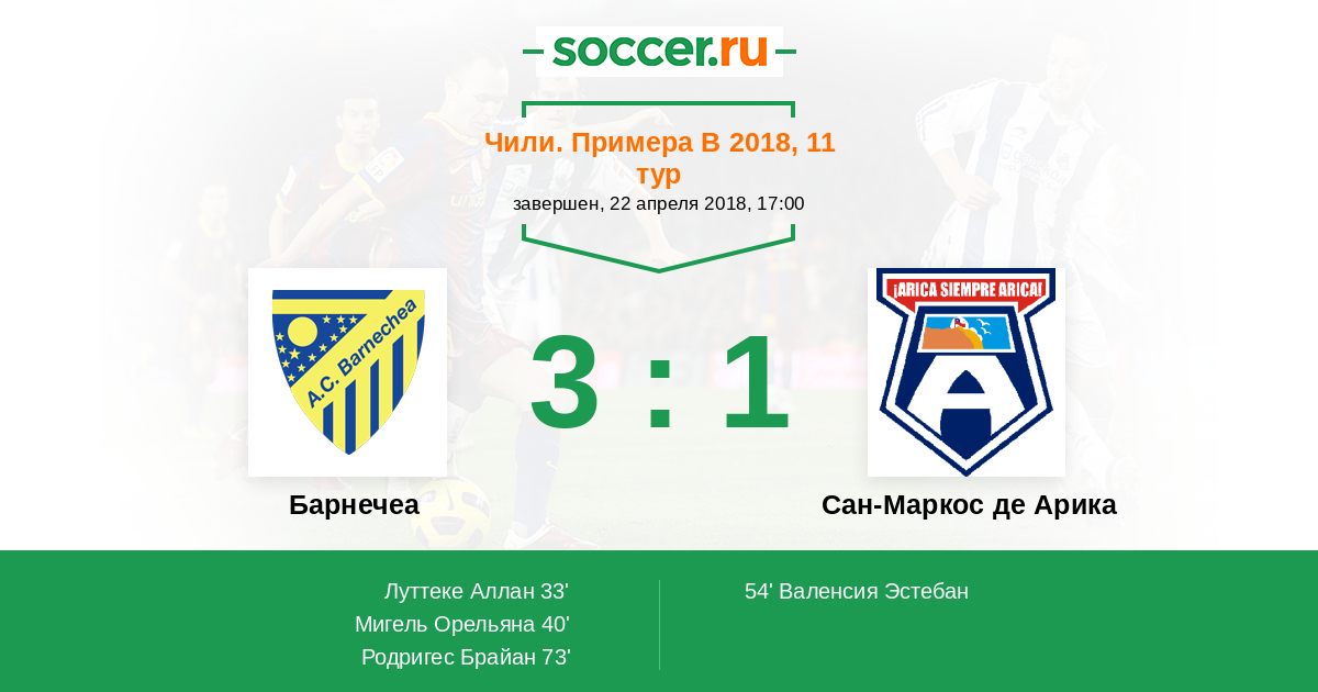 Чили. Примера В 30.07.2017 Сан-Маркос де Арика Логотип футбольный клуб Сан-Маркос де Арика 3:1 Логотип футбольный клуб Барнечеа (Сантьяго) Барнечеа