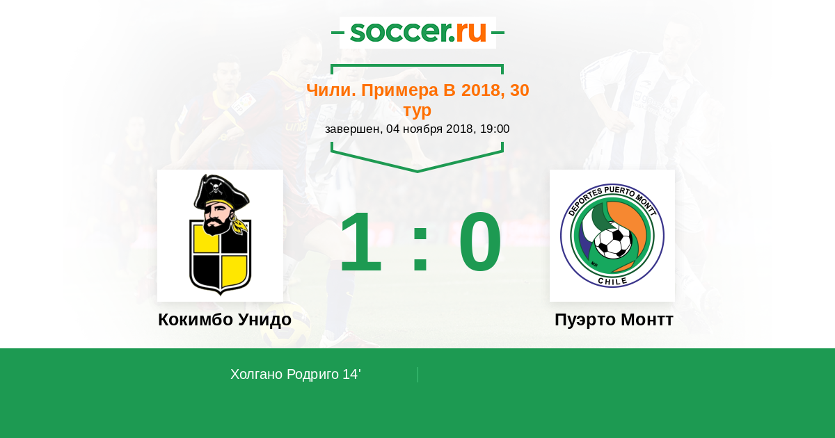 Чили. Примера В 30.10.2016 Кокимбо Унидо Логотип футбольный клуб Кокимбо Унидо 1:0 Логотип футбольный клуб Пуэрто Монтт Пуэрто Монтт