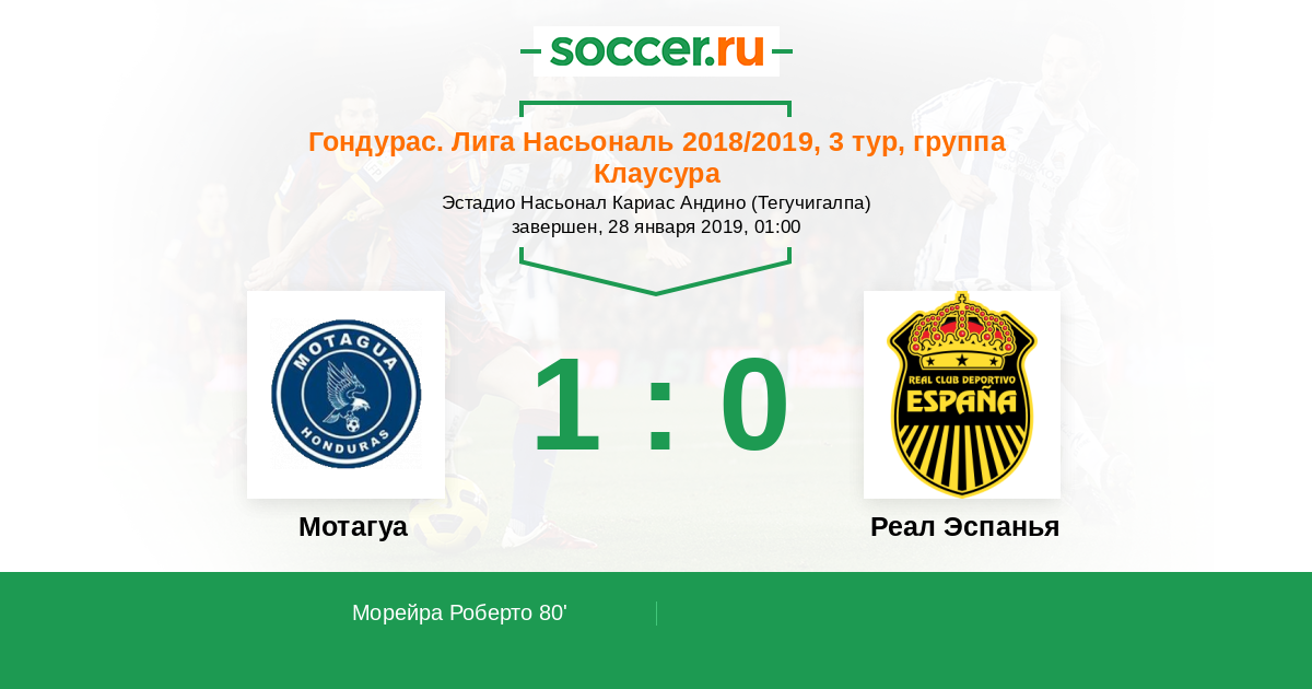 Гондурас. Лига Насьональ 13.08.2018 Мотагуа Логотип футбольный клуб Мотагуа (Тегусигальпа) 1:0 Логотип футбольный клуб Реал Эспанья (Сан-Педро-Сула) Реал Эспанья