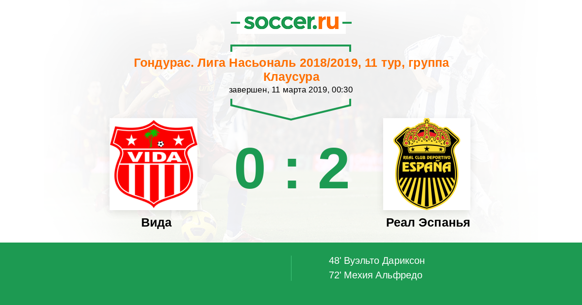 Гондурас. Лига Насьональ 06.03.2011 Вида Логотип футбольный клуб Вида (Ла-Сейба) 0:1 Логотип футбольный клуб Реал Эспанья (Сан-Педро-Сула) Реал Эспанья