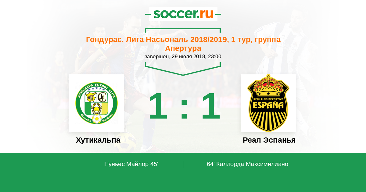 Гондурас. Лига Насьональ 19.03.2016 Хутикальпа Логотип футбольный клуб Хутикальпа 1:1 Логотип футбольный клуб Реал Эспанья (Сан-Педро-Сула) Реал Эспанья
