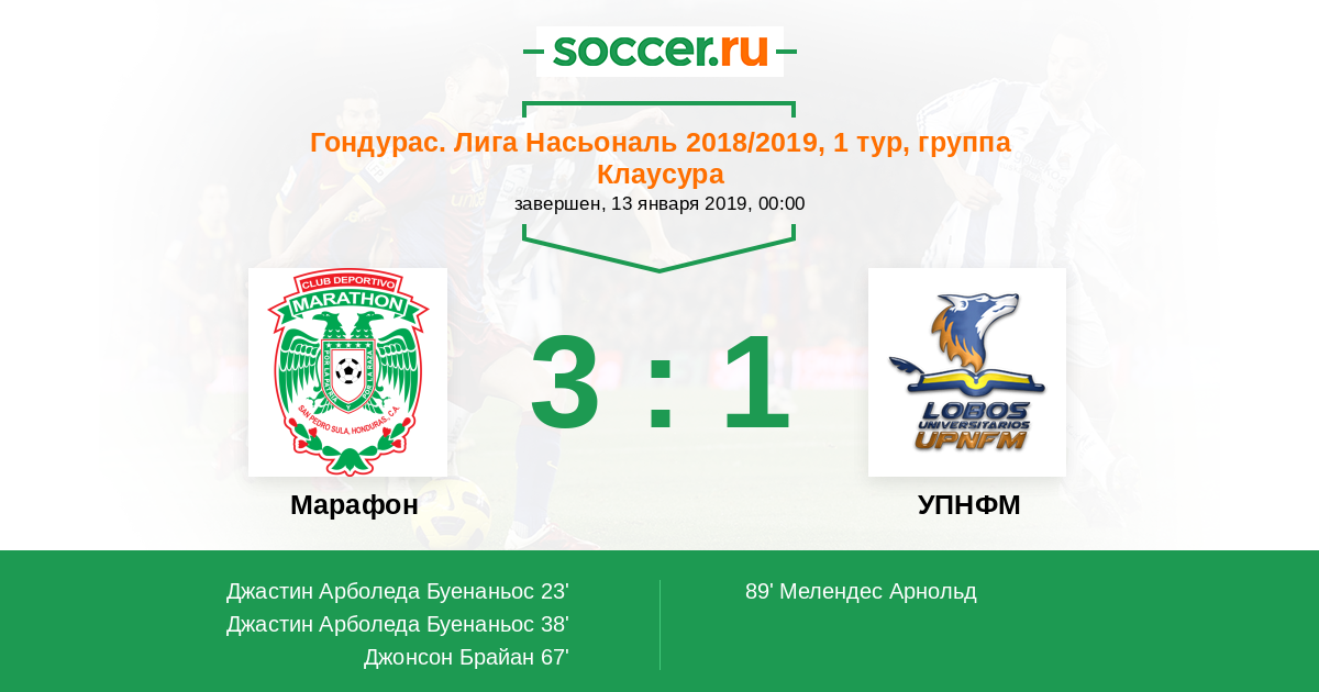 Гондурас. Лига Насьональ 25.01.2018 Марафон Логотип футбольный клуб Марафон (Сан-Педро-Сула) 3:2 Логотип футбольный клуб УПНФМ (Тегусигальпа) УПНФМ