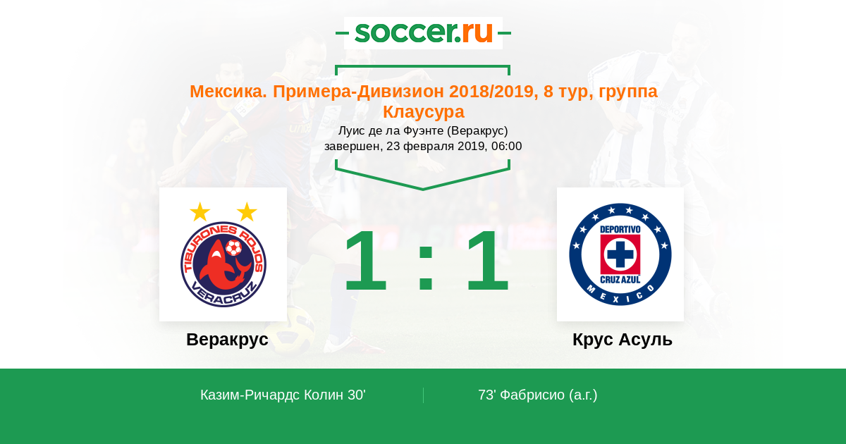 Мексика. Примера-Дивизион 14.09.2019 Веракрус Логотип футбольный клуб Веракрус 0:0 Логотип футбольный клуб Крус Асуль (Мехико) Крус Асуль