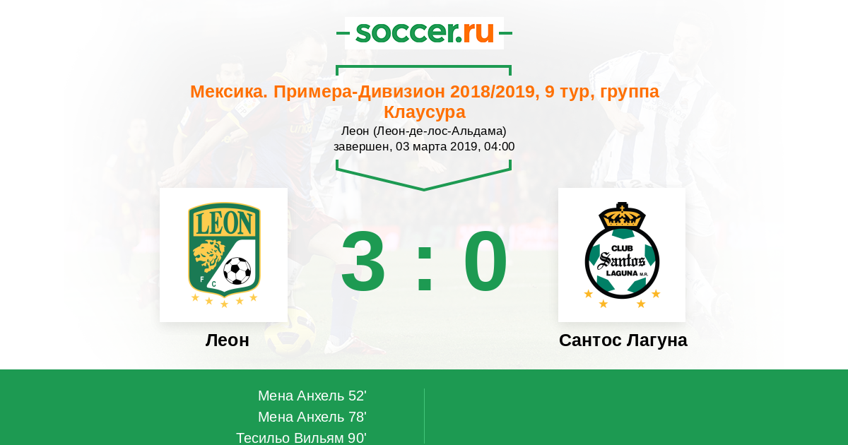 Мексика. Примера-Дивизион 20.03.2023 Леон Логотип футбольный клуб Леон 4:1 Логотип футбольный клуб Сантос Лагуна (Торреон) Сантос Лагуна