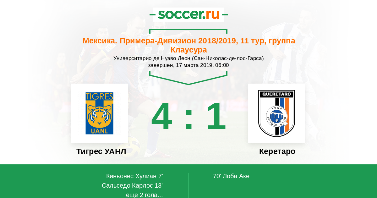 Мексика. Примера-Дивизион 06.05.2017 Керетаро Логотип футбольный клуб Керетаро (Сантьяго-де-Керетаро) 1:5 Логотип футбольный клуб Тигрес УАНЛ (Монтеррей) Тигрес УАНЛ