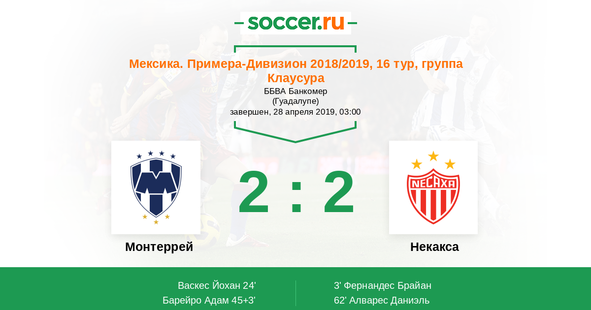 Мексика. Примера-Дивизион 10.05.2019 Некакса Логотип футбольный клуб Некакса (Агуаскальентес) 1:0 Логотип футбольный клуб Монтеррей Монтеррей