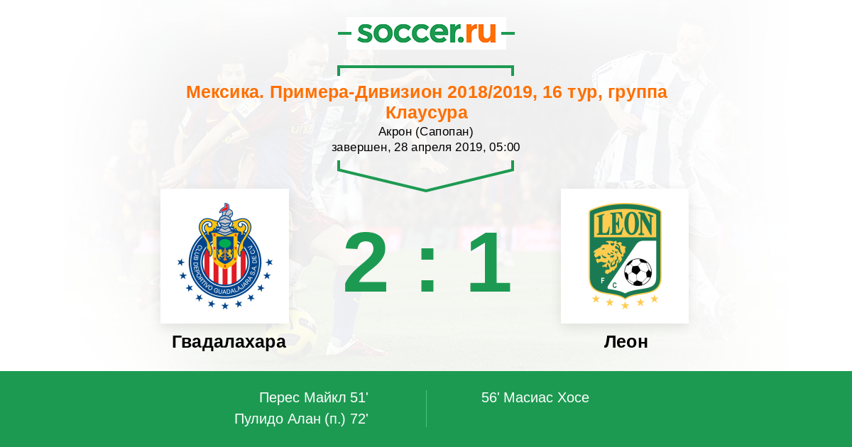 Мексика. Примера-Дивизион 29.04.2018 Гвадалахара Логотип футбольный клуб Гвадалахара 0:2 Логотип футбольный клуб Леон Леон