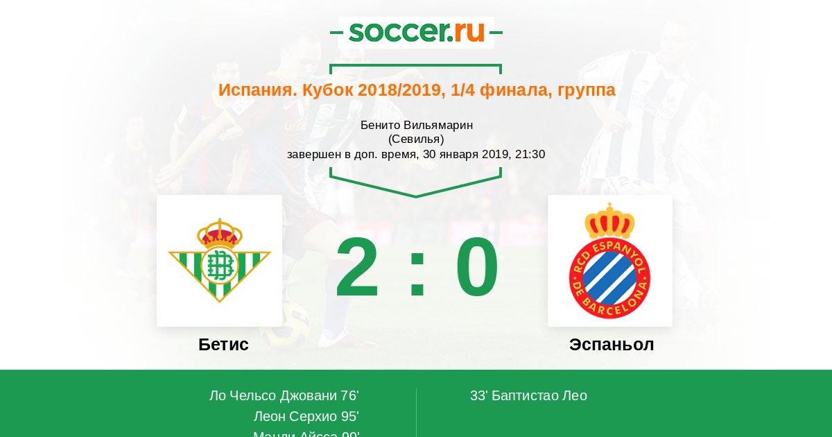 Испания. Кубок 24.01.2019 Эспаньол Логотип футбольный клуб Эспаньол (Барселона) 1:1 Логотип футбольный клуб Бетис (Севилья) Бетис