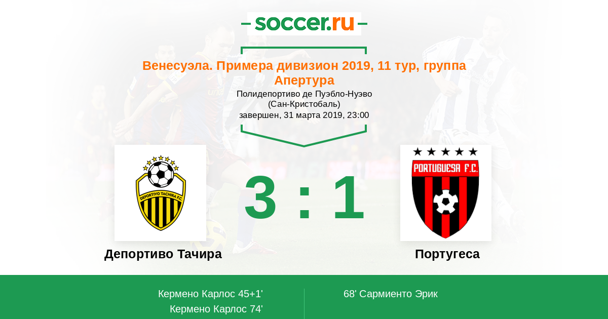 Венесуэла. Примера дивизион 17.09.2016 Португеса Логотип футбольный клуб Португеса (Акаригуа) 3:1 Логотип футбольный клуб Депортиво Тачира (Сан-Кристобаль) Депортиво Тачира