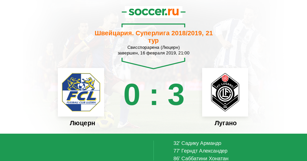 Швейцария. Суперлига 02.04.2017 Люцерн Логотип футбольный клуб Люцерн 0:2 Логотип футбольный клуб Лугано Лугано