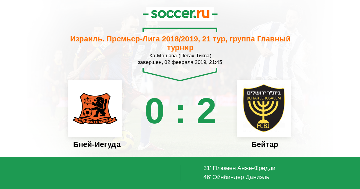 Израиль. Премьер-Лига 19.02.2018 Бейтар Логотип футбольный клуб Бейтар (Иерусалим) 2:0 Логотип футбольный клуб Бней-Иегуда (Тель-Авив) Бней-Иегуда
