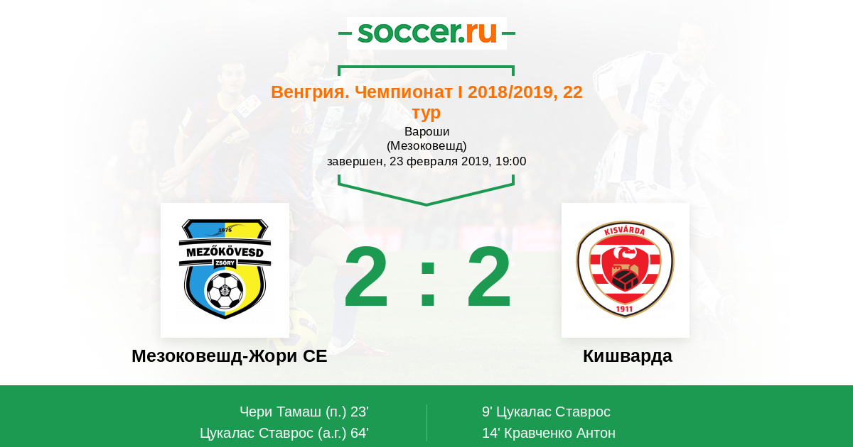 Венгрия. Чемпионат 1 18.03.2023 Мезоковешд-Жори СЕ Логотип футбольный клуб Мезоковешд-Жори СЕ 1:1 Логотип футбольный клуб Кишварда Кишварда