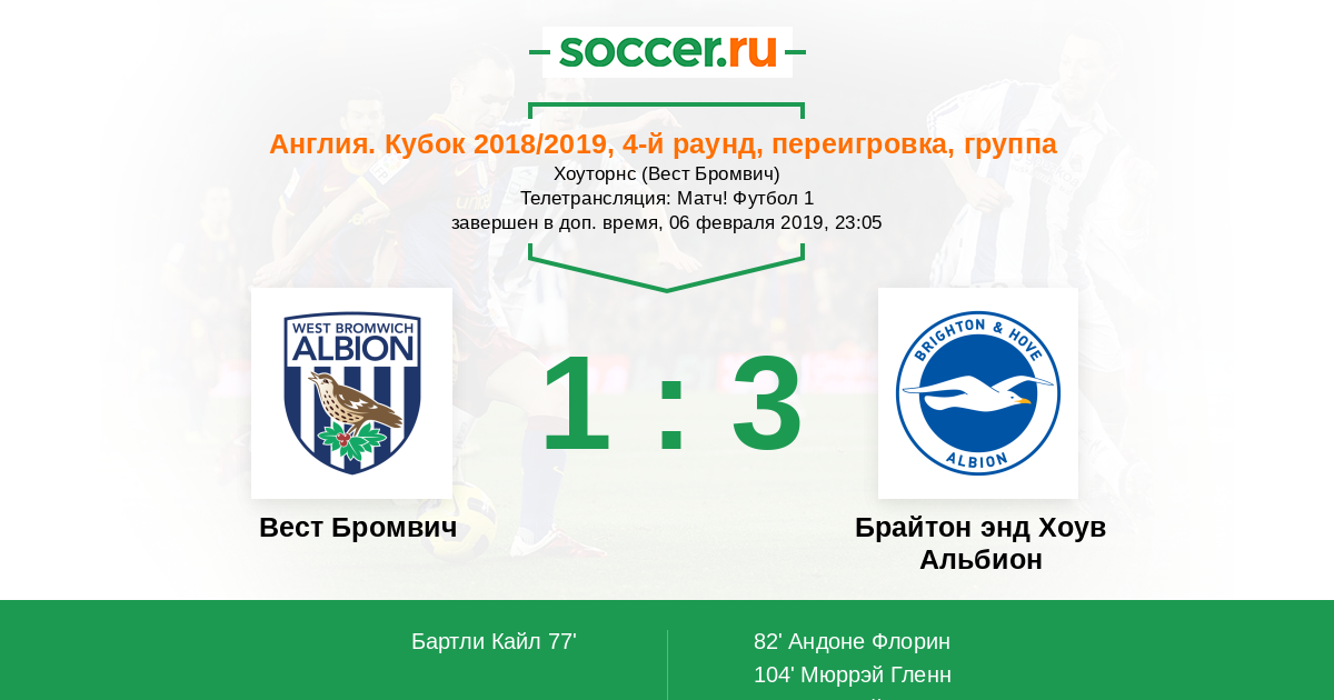 Англия. Кубок 26.01.2019 Брайтон энд Хоув Альбион Логотип футбольный клуб Брайтон энд Хоув Альбион 0:0 Логотип футбольный клуб Вест Бромвич Вест Бромвич