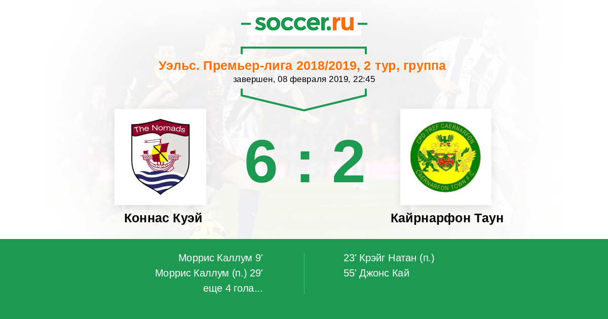 Уэльс. Премьер-Лига 05.04.2019 Кайрнарфон Таун Логотип футбольный клуб Кайрнарфон Таун 1:0 Логотип футбольный клуб Коннас Куэй Коннас Куэй
