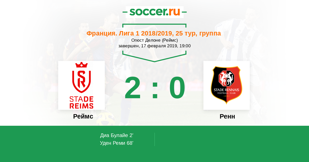 Франция. Лига 1 16.02.2020 Реймс Логотип футбольный клуб Реймс 1:0 Логотип футбольный клуб Ренн Ренн