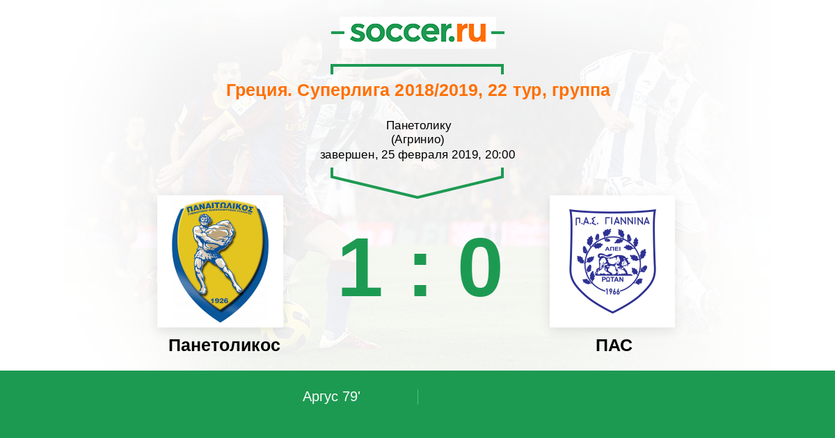 Греция. Суперлига 05.03.2016 ПАС Логотип футбольный клуб ПАС (Яннина) 2:0 Логотип футбольный клуб Панетоликос (Агринио) Панетоликос