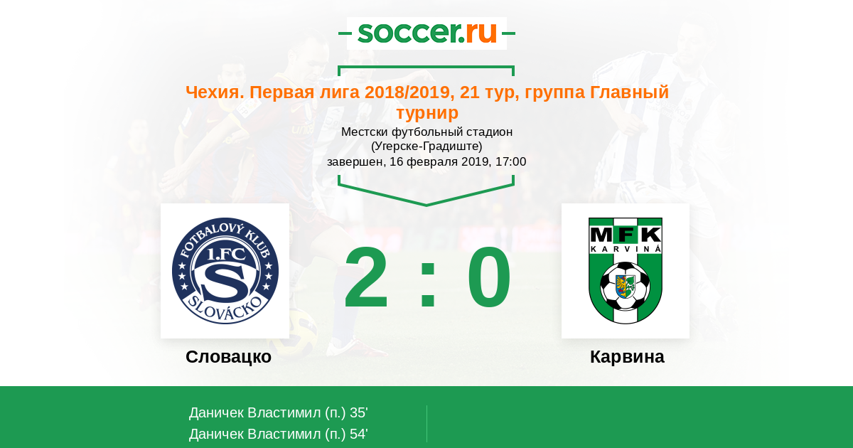 Чехия. Первая Лига 20.10.2019 Карвина Логотип футбольный клуб Карвина 0:2 Логотип футбольный клуб Словацко (Угерске-Градиште) Словацко