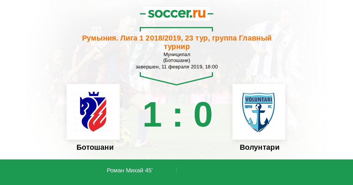 Румыния. Лига 1 18.03.2019 Волунтари Логотип футбольный клуб Волунтари (Илфов) 2:1 Логотип футбольный клуб Ботошани Ботошани