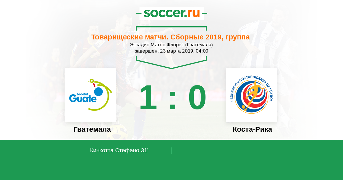 Товарищеские матчи. Сборные 02.06.2012 Гватемала Логотип Гватемала 1:0 Логотип Коста-Рика Коста-Рика