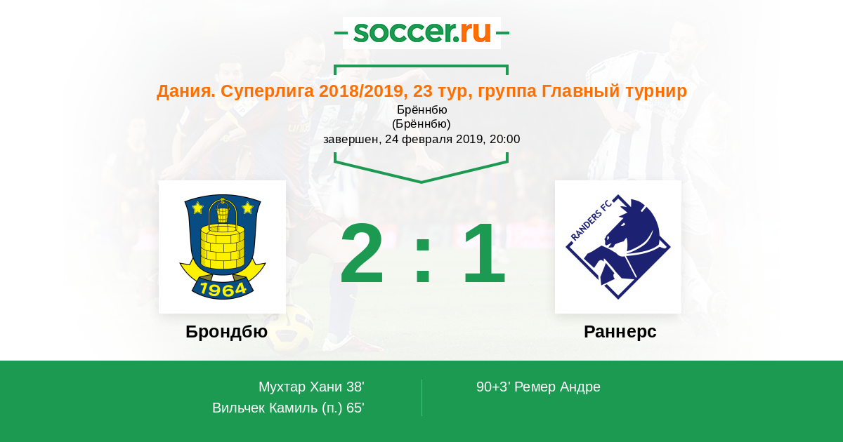Дания. Суперлига 13.03.2016 Брондбю Логотип футбольный клуб Брондбю (Брённбю) 1:0 Логотип футбольный клуб Раннерс Раннерс