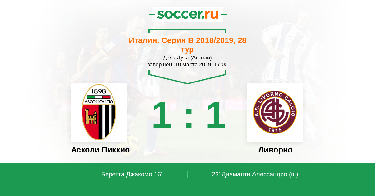 Италия. Серия В 27.10.2018 Ливорно Логотип футбольный клуб Ливорно 1:0 Логотип футбольный клуб Асколи Пиккио (Асколи-Пичено) Асколи Пиккио